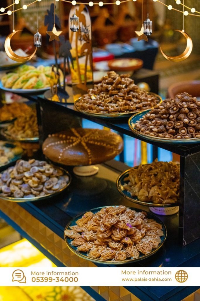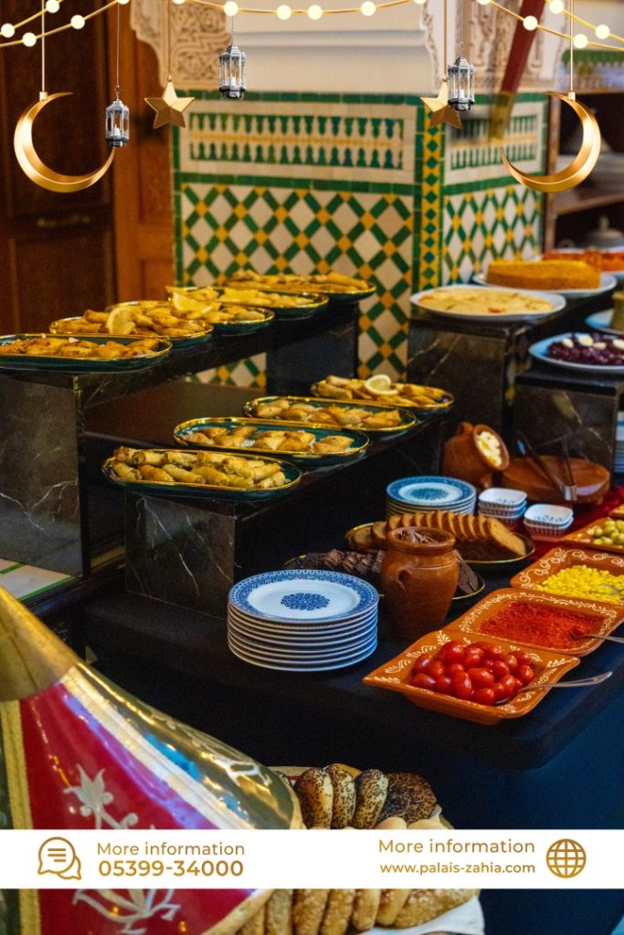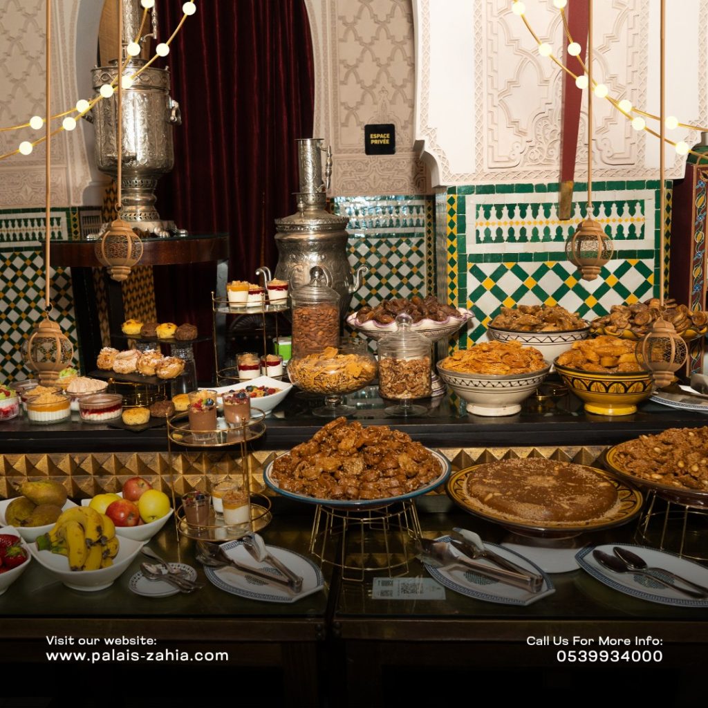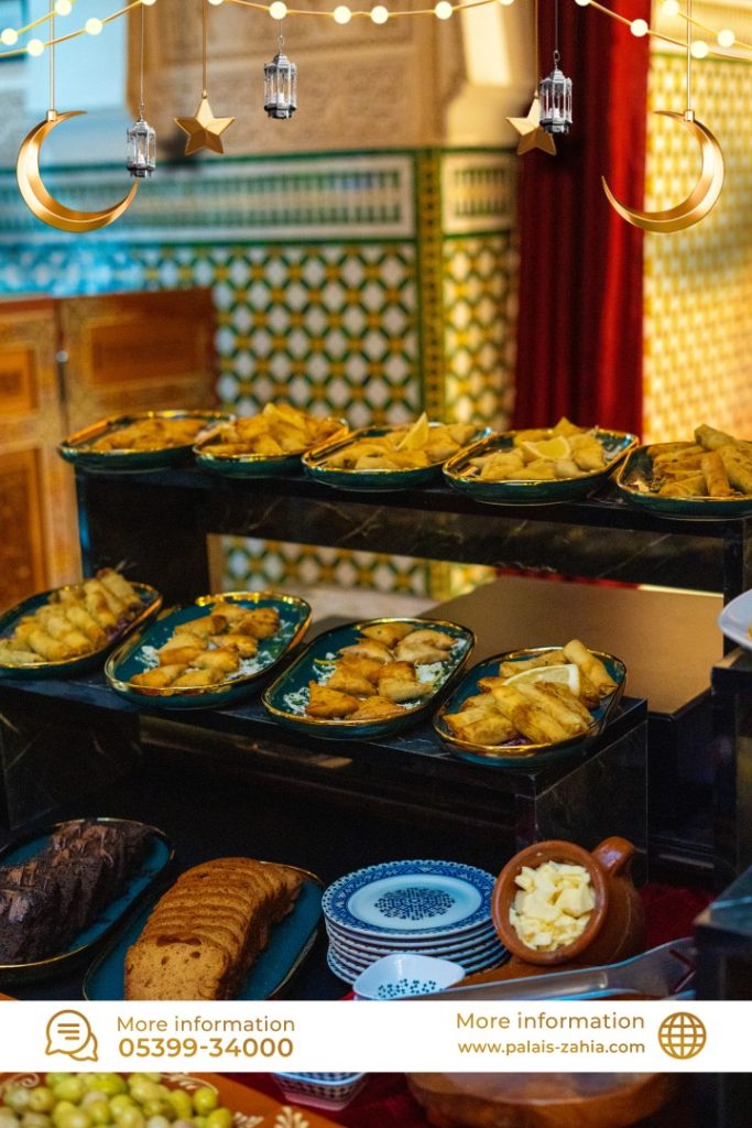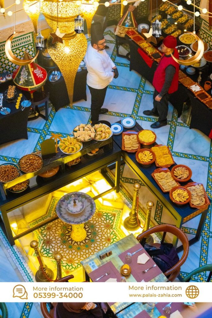 The Grand Moroccan Table at Palais Zahia in Tangier is a unique destination where Moroccan hospitality and the art of living are truly celebrated. At the time of breaking the fast, Palais Zahia invites you on a refined culinary journey across the different regions of the Kingdom. Each week during Ramadan, a different region is highlighted, showcasing the authentic flavors of Marrakech, Casablanca, Fez, and Tangier. The ftour menu features essential Ramadan favorites such as chebakia, msemens, eggs with khliî, and the famous briouates. Alongside these classics, you will discover signature regional dishes: beef or sea bream tangia inspired by Marrakech, chicken rfissa representing Casablanca, traditional fassi chicken and vegetable soup from Fez, and a flavorful northern-style fish ball tagine from Tangier. Each weekly ftour menu is carefully crafted by the chefs of Palais Zahia, honoring pure Moroccan culinary traditions while offering guests an elegant and memorable dining experience in the heart of Tangier.