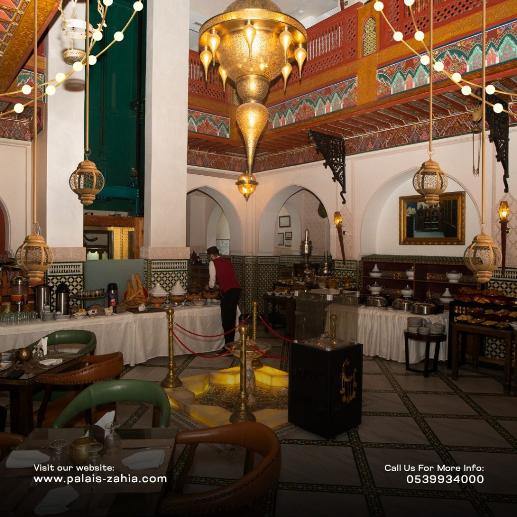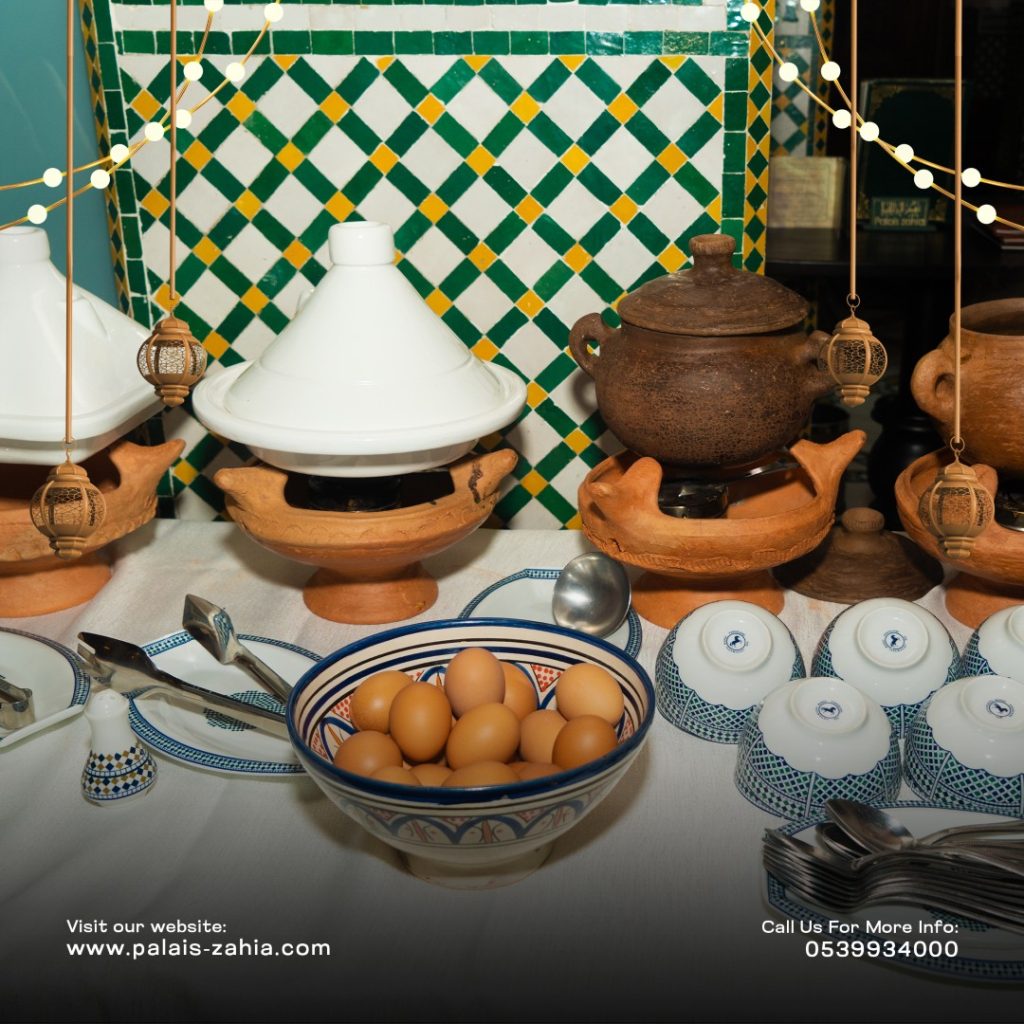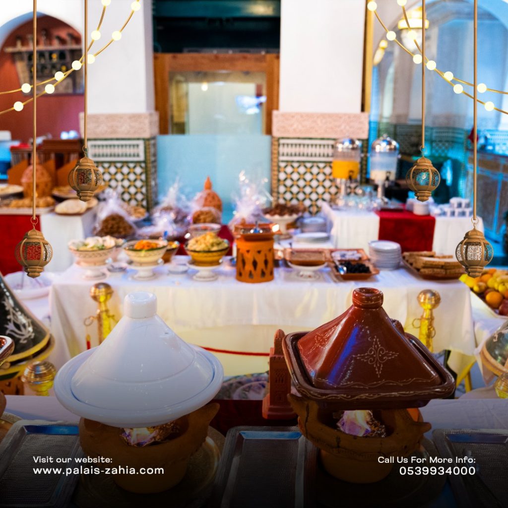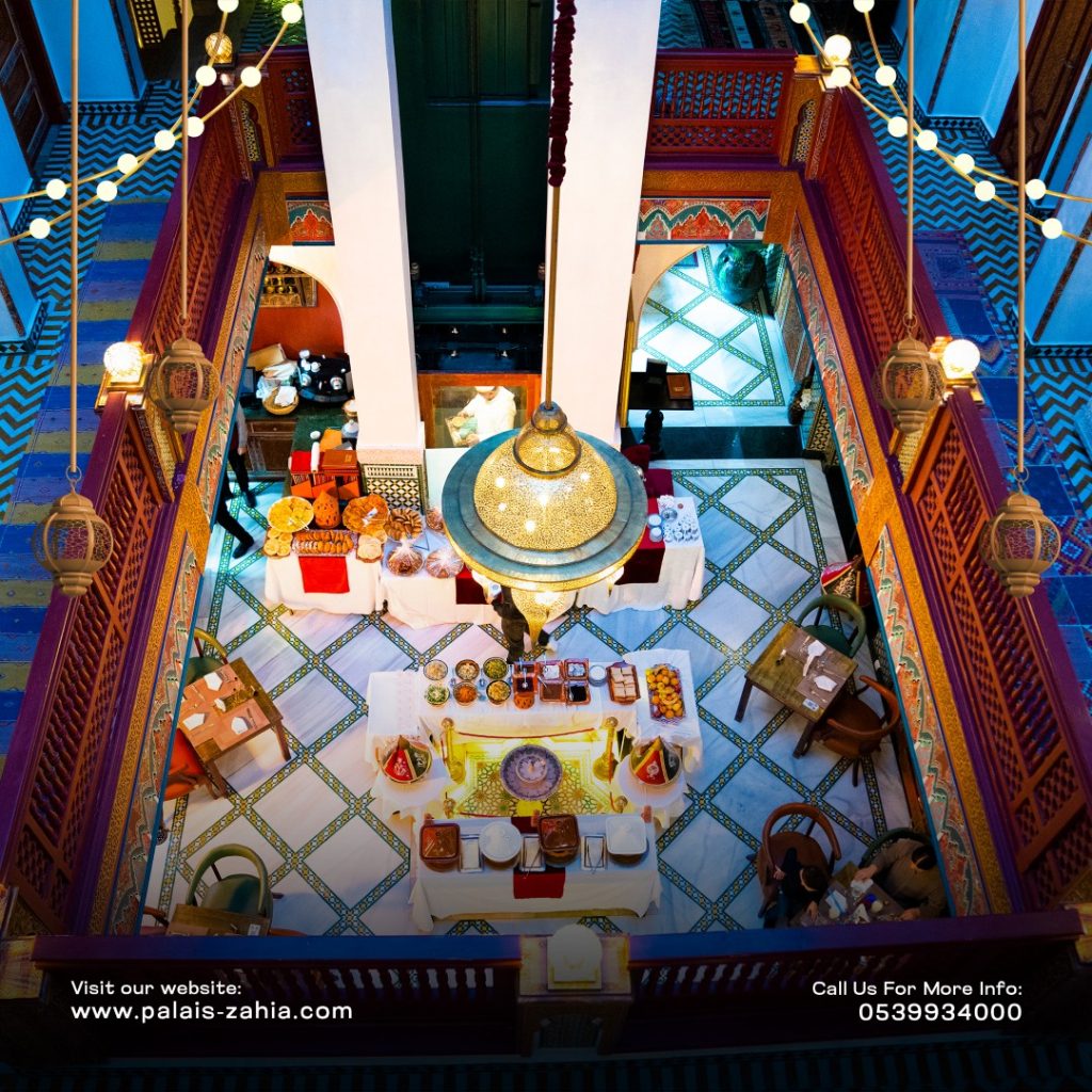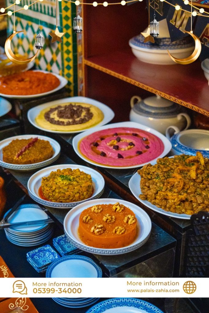 The Grand Moroccan Table at Palais Zahia in Tangier is a unique destination where Moroccan hospitality and the art of living are truly celebrated. At the time of breaking the fast, Palais Zahia invites you on a refined culinary journey across the different regions of the Kingdom. Each week during Ramadan, a different region is highlighted, showcasing the authentic flavors of Marrakech, Casablanca, Fez, and Tangier. The ftour menu features essential Ramadan favorites such as chebakia, msemens, eggs with khliî, and the famous briouates. Alongside these classics, you will discover signature regional dishes: beef or sea bream tangia inspired by Marrakech, chicken rfissa representing Casablanca, traditional fassi chicken and vegetable soup from Fez, and a flavorful northern-style fish ball tagine from Tangier. Each weekly ftour menu is carefully crafted by the chefs of Palais Zahia, honoring pure Moroccan culinary traditions while offering guests an elegant and memorable dining experience in the heart of Tangier.